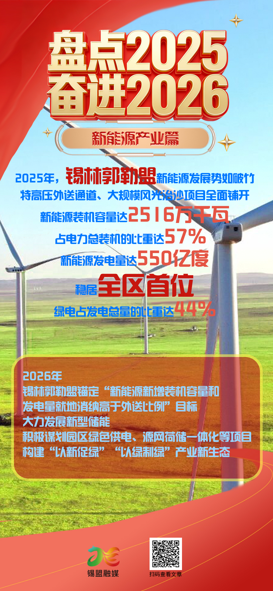 2025年,锡林郭勒盟锚定高质量发展航向,以铸牢中华民族共同体意识为主线,在新能源崛起、产业集群突破、生态保护提质、民生福祉增进等领域交出了亮眼答卷。从全区领先的新能源装机数据到全国民族团结进步示范盟的成功创建,从文旅融合的创新实践到草原治理的坚实成效,每一项成就都凝聚着全盟各族干部群众的同心协力,每一步跨越都彰显着奋进实干的锡林郭勒精神。为全面展示过去一年的发展硕果,凝聚新一年的奋进力量,本报特推出“盘点2025 奋进2026”主题系列报道。敬请关注!